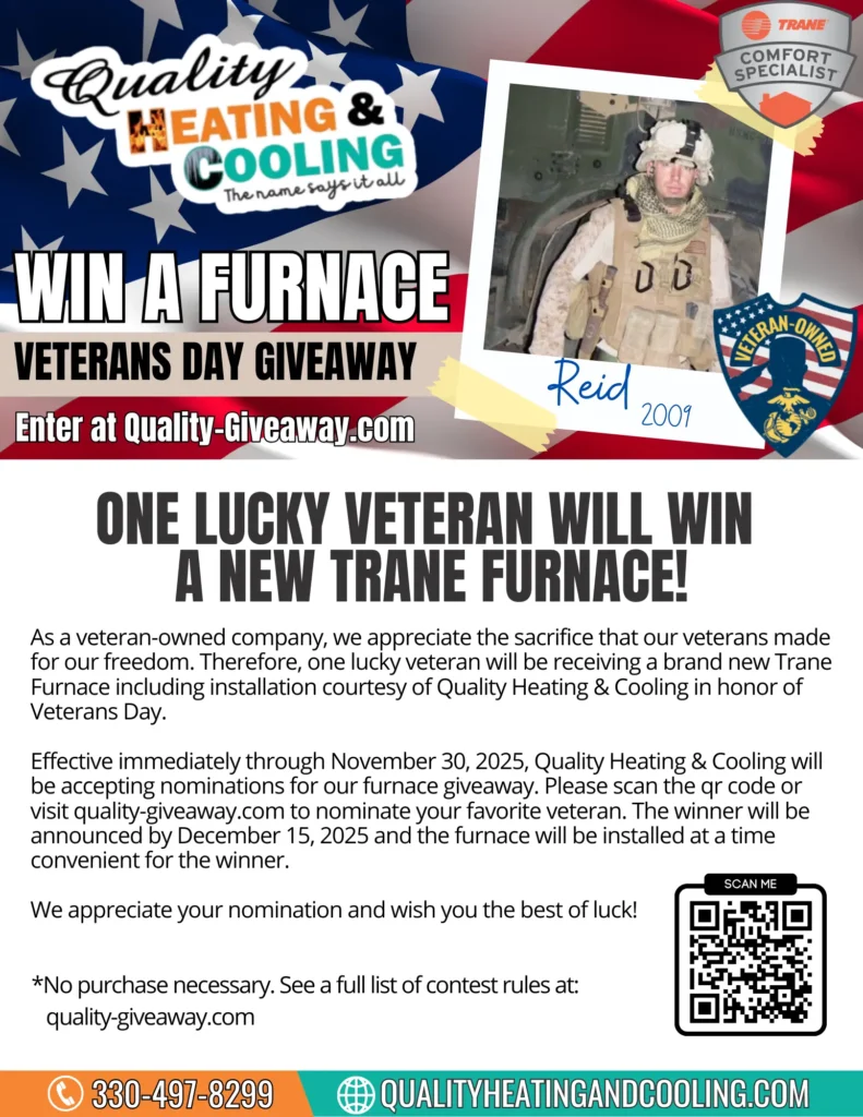 Effective immediately through November 30, 2025, Quality Heating & Cooling will be accepting nominations for our furnace giveaway. If you are a veteran, please submit an entry below. If you are not a veteran, please nominate a veteran you know! The winner will be announced by December 15, 2025 and the furnace will be installed at a time convenient for the winner.